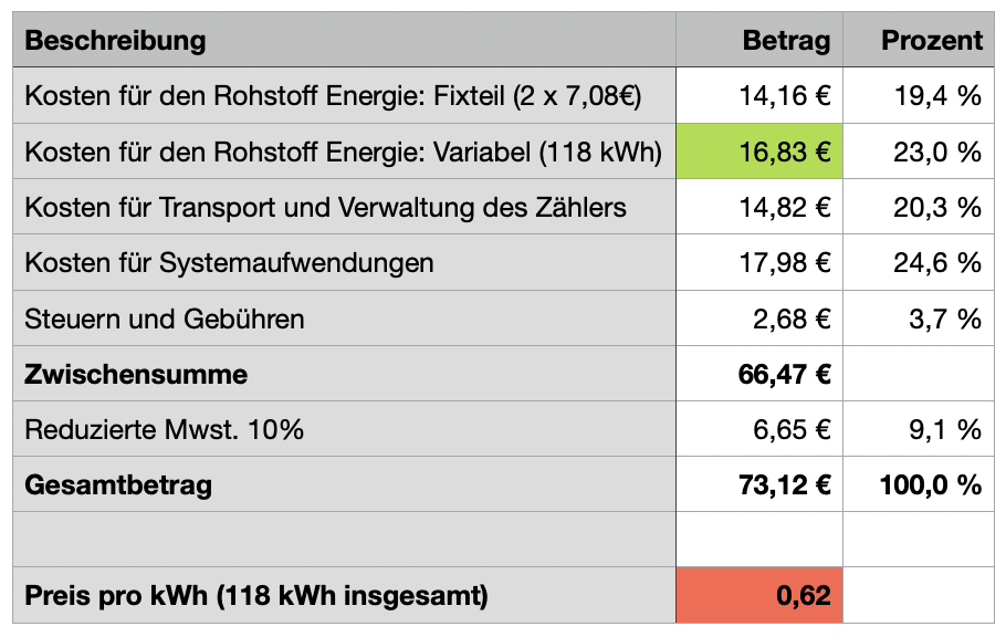 masterblaster Kruz 0,36 €/kWh naja, recht viel darunter wird man kaum kommen. Die Netzentgelte, Systemkosten und Grundkosten machen ja eh den Großteil aus (vor allem wenn man eh schon wenig verbraucht).